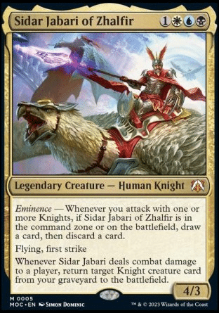 That said, Sidar Jabari’s looting ability becomes much more powerful when combined with its triggered ability. When Sidar Jabari successfully deals combat damage, this card can resurrect a Knight. Since you can discard reanimation targets to your Eminence ability, this gives the deck an interesting angle that makes a lackluster, but relatively consistent, ability much more powerful. Sidar Jabari also has First Strike and Flying, making it difficult to block.