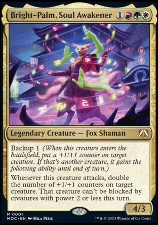 According to Gavin Verhey, Call For Backup is a +1/+1 counter themed deck, and Bright-Palm’s ability seems to support that. The Backup ability doubles +1/+1 counters on a target creature, which means the creature with the activated ability doesn’t necessarily need to target itself. That said, there may be an extra incentive in the deck when successfully dealing combat damage since Bright-Palm’s ability comes built-in with some evasion.