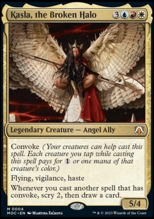 Kasla, the Broken Halo is one of the Commanders in the Convoke-themed Divine Convocation Jeskai preconstructed Commander deck, and this Convoke payoff looks sweet! Kasla hits fast and hard, allowing for a Voltron strategy if players are interested in it. While six mana is a lot for a Commander, Kasla does have Convoke. This means that should you have enough creatures, you can pay for Kasla without tapping any mana.
