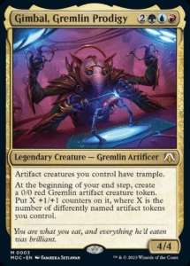 Gimbal, Gremlin Prodigy provides yet another artifact synergy to Commander players interested in exploring it. This Temur Commander available in the Tinker Time Commander deck is interested in the amount of differently named artifact tokens you control. You get to create a 0/0 red Gremlin artifact creature token with +1/+1 counters on it equal to the number of differently named artifact tokens that you do control.