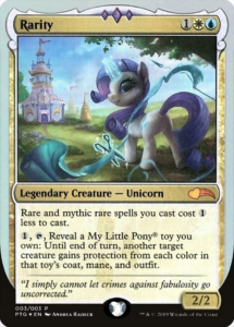 This basically means that your table agrees to allow you to play with the MTG My Little Pony cards. That said, some of the MTG MLP cards will need some clarification before you play. While many of the new cards from Ponies: the Gathering 2 translate pretty seamlessly to MTG play, some of the older ones use some terms like Everypony that may be a bit loose in translation. Otherwise, if you’re planning on Rule Zeroing these cards into play, you may want to bring a few toys along with you since both Rarity and Applejack interact with them.