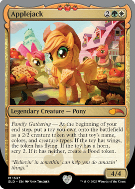 Applejack features the silver-bordered mechanic of bringing items outside of MTG into the game. If you’re going to Rule Zero this card at your table, be sure to bring some toys along with you to make the most of Applejack’s effects.