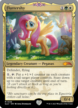 Fluttershy’s silver-bordered mechanic cares about the artwork of the MTG card. You could go the extra mile and attach literal tails to your cards, but Fluttershy’s ability likely refers to the card having a tail in the artwork. Stare down is a cute flavor term for something that can easily be translated into MTG rules terms.