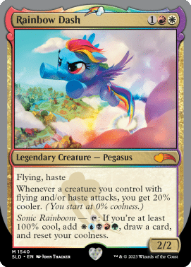 If you start seeing MTG MLP cards getting rule zeroed at your table, Rainbow Dash is likely the one you’re going to run into the most. Not only is Rainbow Dash incredibly easy to translate to MTG rules terms (Coolness could have just been a ‘cool counter’ that resets at 5. The card would be perfectly legal) and happens to go infinite with one of the most competitive Commanders in the game: Najeela, the Blade Blossom.