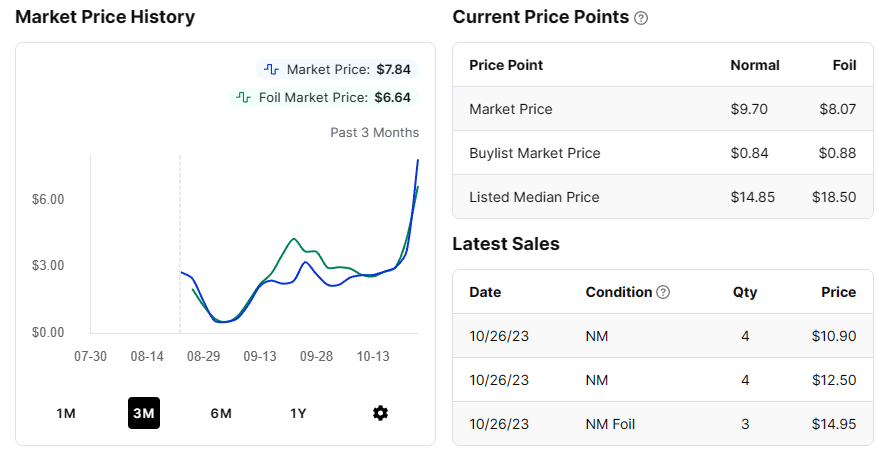 As a result, the race to collect Questing Druids has had a massive impact on the card’s price this past week. Only worth a little under $3 before last weekend, Questing Druid is now selling for, on average, around $10 apiece. As recent sales suggest, however, copies of this card are selling for as much as $15, a more than 400% increase to this card’s previous price. Since this spike is so fresh, astute buyers can find this card for a cheaper price.