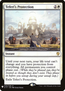 Teferi’s Protection allows its caster to, essentially, cease to exist for a turn. This is a great way of getting out of any effect that will massively affect your board or life total. There are some bizarre scenarios where Teferi’s Protection will not work but, for the most part, this is the equivalent of a white get out of jail free card.