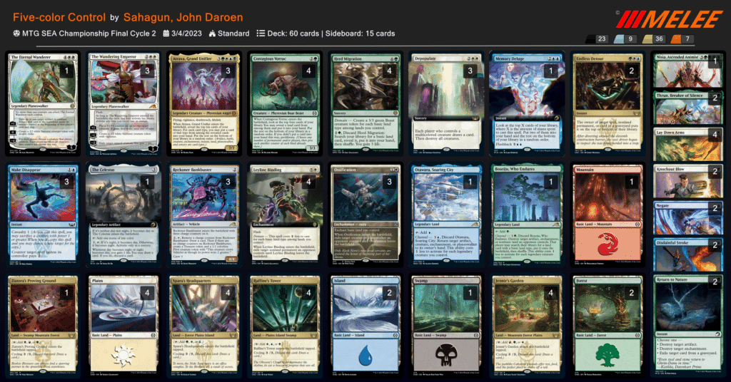 Season two’s Regional Championships are finally underway, and the first batch of tournaments has been concluded. One Player from each of these events is invited to the World Championships for 2023, so there is a lot on the line. The format is Standard, meaning the Grixis decks that everyone is so familiar with on MTG Arena have taken over the tournament. Even though Grixis had a massive showing and won a World Championship spot of its own, two bizarre decks that most players did not plan for managed to win World Championship spots! We’ll take a look at Rei Sato’s Selesnya Toxic list and quickly mention a new Domain Control brew that Arena players should watch out for on Ladder.