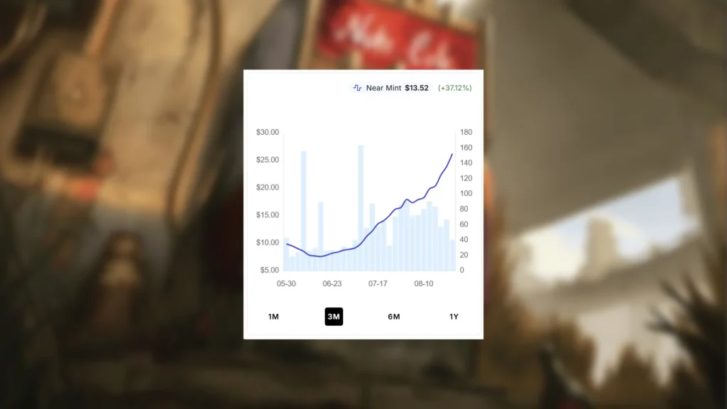 This brings the traditional nonfoil variant of Nuka-Cola Machine more in line with its other printings. The nonfoil borderless variant of Nuka-Cola Vending Machine goes for about $31 at the time of writing, but is also trending upwards rather quickly. This variant has experienced a $10 price spike since the beginning of August. Traditional Foil variants for this card sell for about $40.