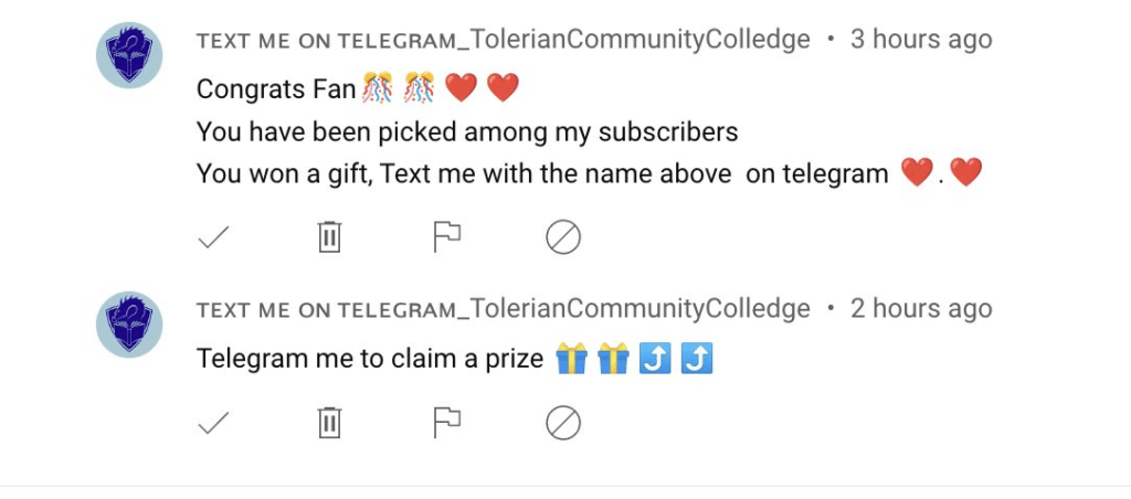 These seem to be everywhere. No matter what genre you look into, these bots asking for messages on various platforms are plaguing YouTube commenters with an ‘opportunity’ to win a prize from their idols.