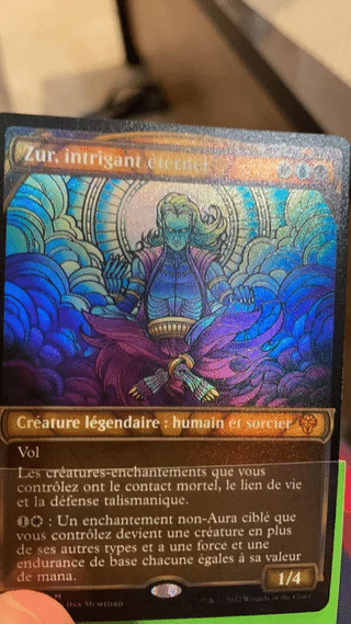 Discussion regarding this unique misprint surfaced at the end of last week, where Redditor Hyorryu showed off a French misprinted Zur, Eternal Schemer. These Textured foils should look like the Zur pictured directly above; the text boxes have texturing. However, the picture of Zur itself has a glassier finish to reflect the stained-glass treatment premiered in Dominaria United. As can be seen in the misprinted Zur pictured as labeled above, the entire card is textured instead of just the text boxes.