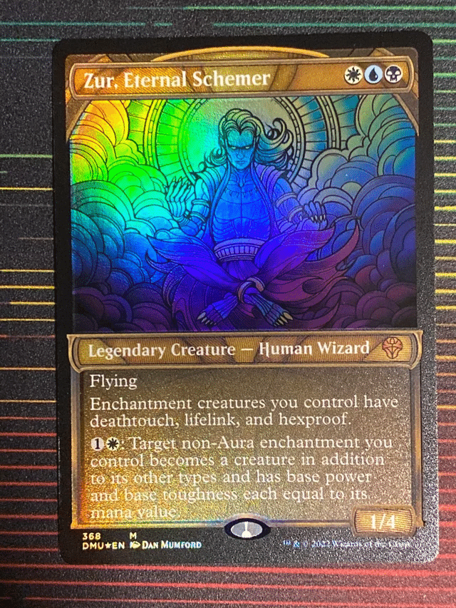 Some Redditors were convinced that this Zur was an Etched Foil but that was quickly disbanded: “Zur didnt have a foil etched showcase variant in DMU. This is a pretty clear print delts between the two printings, if not all the printings for that language” – digitek