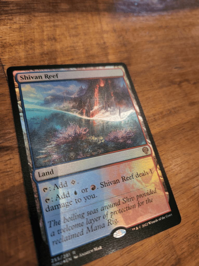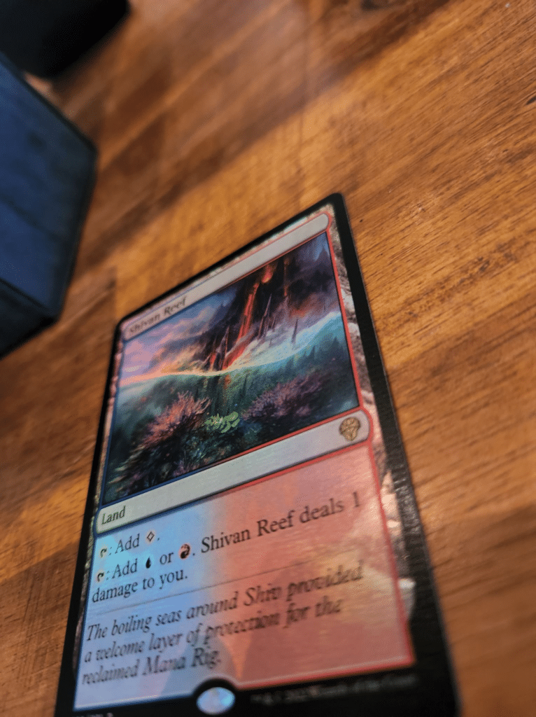 Unlike some of the messier misprints popping up in Dominaria United, these look rare enough that they may be sought after by collectors. After seeing the Shivan Reef in person, I can imagine that textured foils like these will be attractive to a select audience. The ripples are quite beautiful when they line up with the art by chance. Heck, Wizards of the Coast could even make this an official foiling technique in the near future.