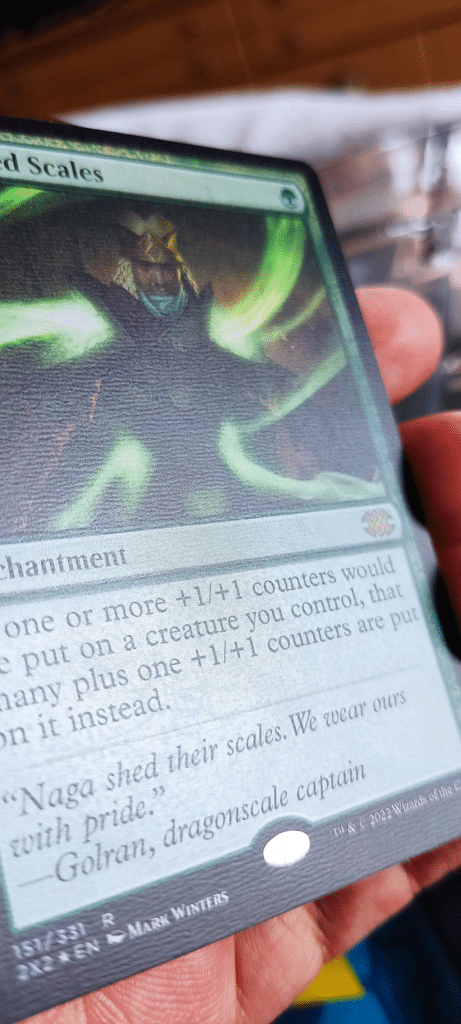 It turns out this foiling error is not exclusive to Dominaria United. Facebook user Noel Gilling posted this Double Masters 2022 Hardened Scales back in July. This error looks identical to the Shivan Reef error pictured above. Noel even posted a video showcasing the textured nature of this error.