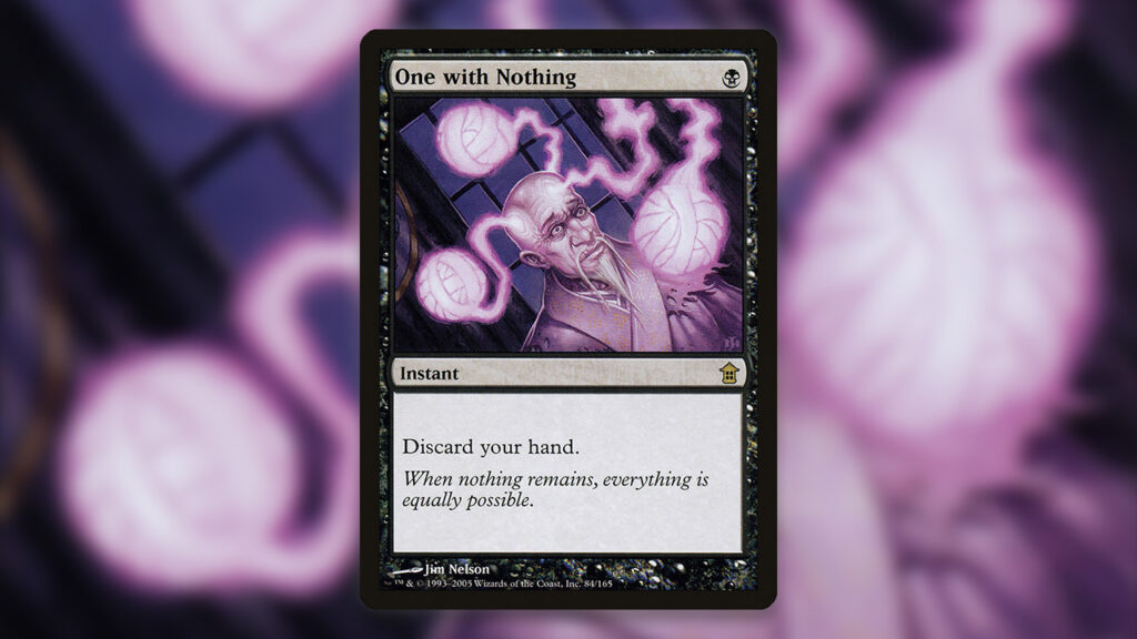 Supposedly, One with Nothing was utilized as a developer-only card on MTG Arena to help test certain situations. Roughly 10 months ago, some players noticed the outline for One with Nothing amongst other black one-drops in the card library, suggesting that the card might be available on MTG Arena in the first place. As it turns out, a Wizards of the Coast employee stated that it was indeed a test card and that it should have remained hidden.