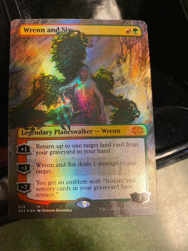 Wrenn and Six are one of the premier chase cards to be found in Double Masters 2022. It is at the core of Modern’s most powerful strategies and is most players’ candidate for the next card to be banned. The featured card is a Full Art Textured Foil. This is a new type of foiling being introduced in Double Masters 2022. This type of foiling is something we’ve never seen before in the game of MTG, and it looks remarkable.