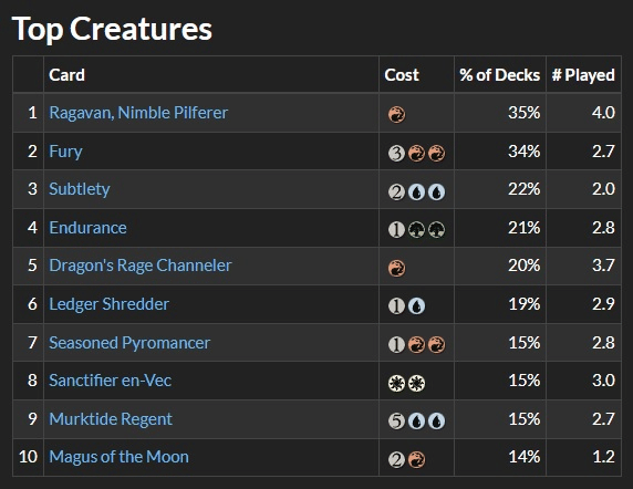 To break down the numbers that players are complaining about on Twitter above, the comparison shown in these three pictures is the percentages of creatures played between varying years. The first image shows the December 2020 metagame, where Noble Hierarch is the most-played creature card at an 18% play rate per deck. The second image shows the now-banned Lurrus of the Dream-Den at a 15% play rate. Fast forward to December 2022, and most of the top 10 list is seeing more play than any of the top creatures in previous years. This is spearheaded by Ragavan, Nimble Pilferer – the card that many consider the best in Modern right now- and a shining example of why players are quitting this format in droves.