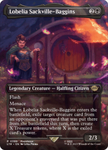 Including Delighted Halfling, Lobelia Sackville-Baggins is the other Rare that you can open as a part of these Prerelease-exclusive promotional cards. This threatens to be quite the powerful ramp tool with its ETB ability. Of course, the card needs some setup to work, but it can be incredibly powerful in the right circumstance. At worst, Lobelia is a three-mana 2/3 Menace with Flash, which can potentially catch a weaker creature off guard in the early game.