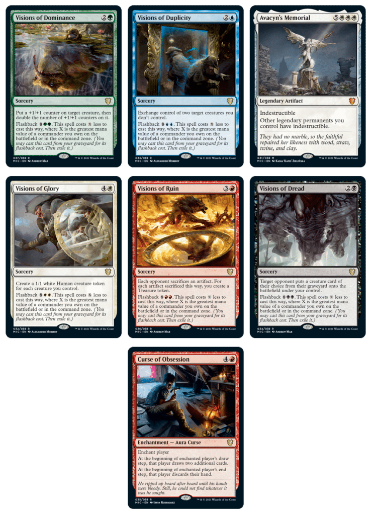 The cards are Visions of Dominance, Visions of Duplicity, Visions of Glory, Visions of Ruin, and Visions of Dread which completes a new cycle of cards for Commander. Going further, Curse of Obsesses and Avacyn’s Memorial are also new to Commander, and only accessible through these Set Boosters. However, there is an eighth card that will be previewed on Weekly MTG on September 9 which according to WotC, is a mythic rare card.
