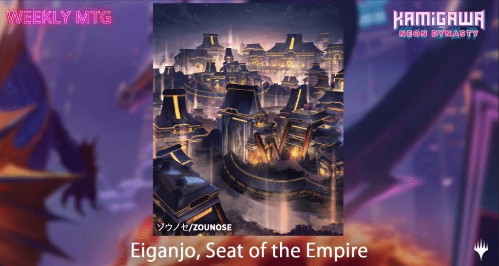 First up we have Eiganjo, Seat of the Empire. Eiganjo is the headquarters of the Imperials, who still have a strong presence in Kamigawa.