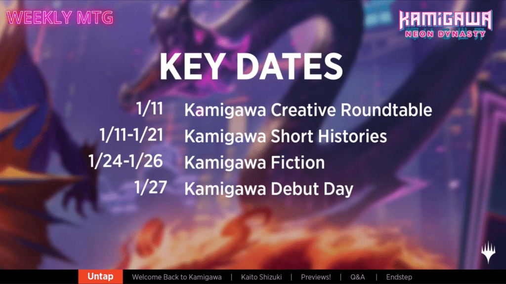 - 1/11 – Kamigawa Creative Round Table: Stream talking about the story, setting, lore etc.