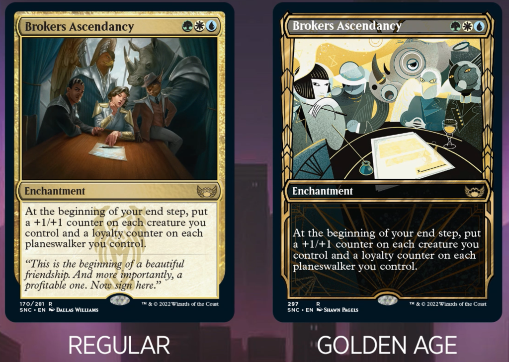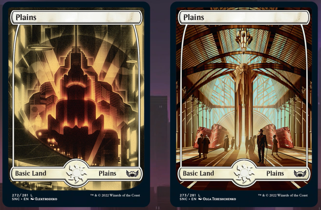 The style of some of this artwork in incredible! We do see vibrant colors just like we did for Neon Dynasty but definitely in a different vibe. This artwork gives off the feel of the Roarin’ 20’s and the Great Gatsby meets Magic.