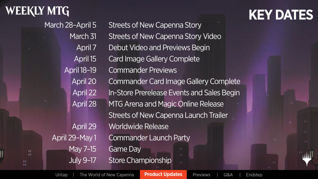 Today we were treated to a little sneak peak in to Magic: the Gathering’s upcoming set, Streets of New Capenna. As Wizards has been doing for the past few sets, this set is called the “Pre-Beat“. This is meant to be a small look at the product for stores and distributors, but also gives the players a couple cards to sink their teeth into.