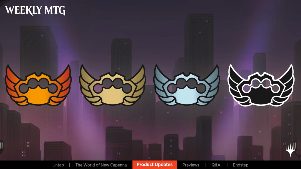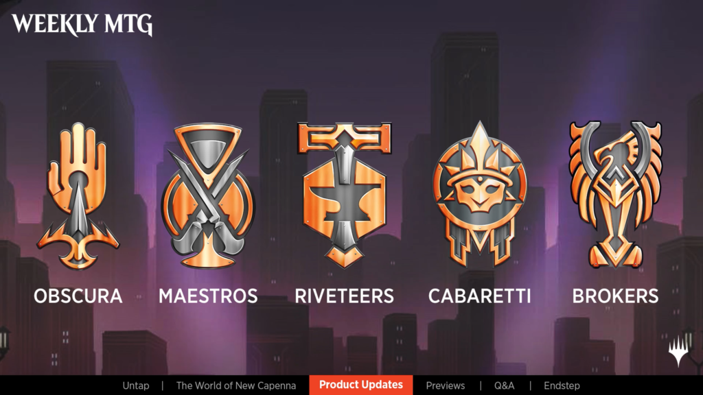 The next set of cards that we’ll show off here need a little background about them. Remember the 5 “Faction Packs” we mentioned earlier for Prerelease? Those 5 Factions are actually powerful families in New Capenna. Each one is ruled by a demon, and if you look closely at some of the art, you can see a crest for some of them in the art. Here’s the crests and the family names, as well as a little bit about them.