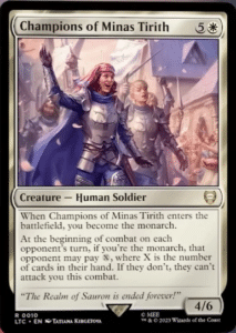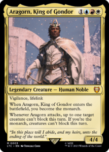 Meanwhile, Aragorn, King of Gondor ETBs and gives you the Monarch, so he’s giving you immediate card advantage. Red and white typically struggle with card draw but are great at making tokens and having great attack steps. Therefore, Aragorn shores up a weakness while being one mana less, does not rely on other conditions, and is a fantastic attacker as he makes your entire board unblockable. His Vigilance and Lifelink are just gravy on top.
