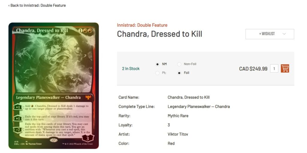 US MTG players may want to consider selling certain chase foils in Canada as they are retailing for double the price they are selling in the US. Chandra, Dressed to Kill is extremely popular in Pioneer, causing an absolute spike in price for the Planeswalker over time. The Double Feature foil version of this card is quite pricey, retailing for a $113 US market median at TCGPlayer. Notably, copies of this card in their sales history are only selling for about $100 – $105. Meanwhile, FacetoFace has Chandra selling for $250 CAD, or $200 US. Looking more into this, it seems like for Canadian players that this is the average rate for a Chandra, Dressed to Kill foil from this set. There are other copies in Canada that are going for less than this, but most prices I was able to find were going for more than $200 CAD, or about $160 US. Needless to say, there’s still a huge price differential here.