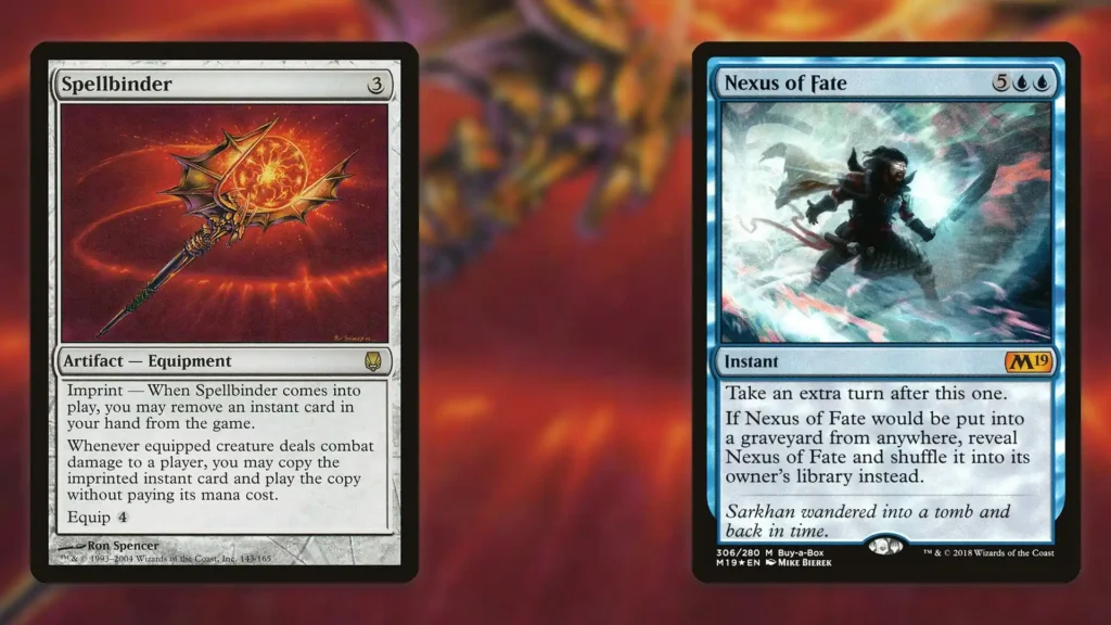 As powerful as Spellbinder is when it copies huge haymakers, it’s even stronger when it’s used to set up infinite combos. Of all the two-card combos available, the simplest and easiest to set up requires Imprinting Nexus of Fate onto Spellbinder. Once equipped to an evasive creature, you’ll easily have infinite turns, making winning trivial.