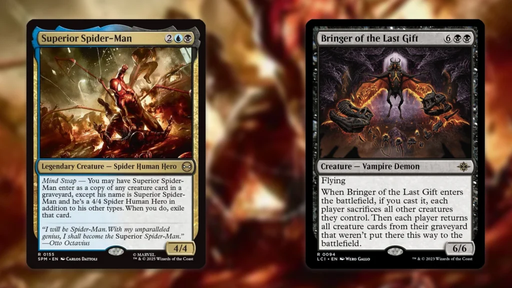 In the context of this Standard deck, once you manage to get Bringer into your graveyard, casting Superior Spider-Man and copying Bringer will force all other creatures in play to get sacrificed while also serving as a mass reanimation effect. Unlike Bringer, Superior Spider-Man only costs four mana to cast, so setting things up in a timely manner is much more realistic.