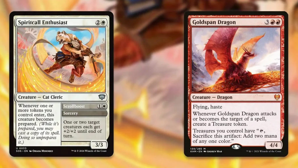 From there, you’re able to cast Scrollboost targeting both Goldspan Dragon and another creature of your choice. This will trigger Goldspan Dragon, netting you a Treasure token. Conveniently, the Treasure entering triggers Spiritcall Enthusiast, making it Prepared once more. Since your Treasures tap for two mana, you can cast Scrollboost again. Eventually, after repeating these steps a bunch of times, you can attack for a boatload of damage.