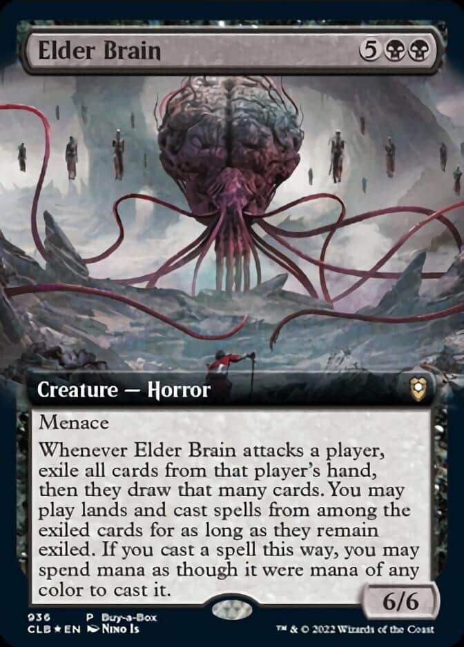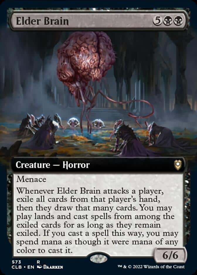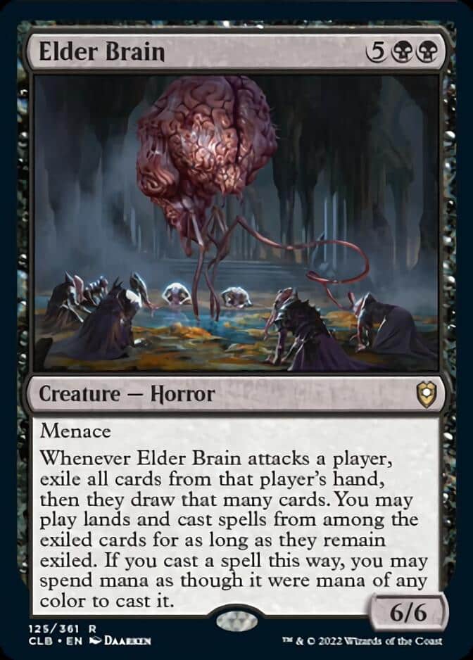 Elder Brain, another beefy creature, is a strange mix of a Memory Jar and Gonti, Lord of Luxury. It has to attack to trigger it’s ability, which is a bit of a drawback, but if you can get it in combat, then you’re looking at some serious advantage. The only downside here is that your opponent does draw a new hand, but that could be a minor downside depending on the deck.