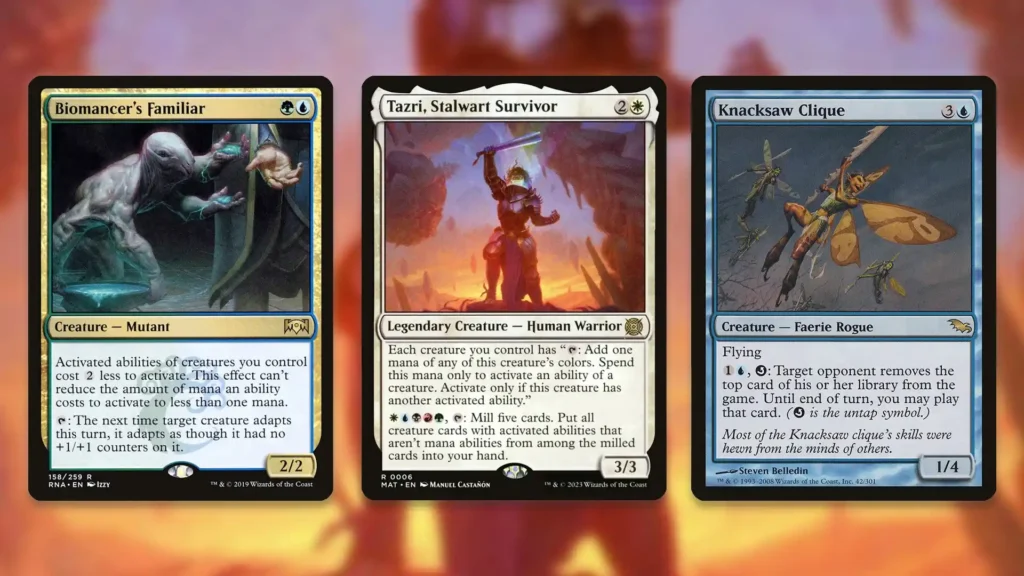 As powerful as your cost reducers are in a general sense, they also open the door for numerous infinite combos. This is primarily thanks to the synergy between Tazri and creatures from the Shadowmoor block that feature the untap symbol. With Tazri in play, Knacksaw Clique and other creatures with an untap activated ability can repeatedly tap for mana, then use that mana to help untap themselves and generate value. Because Biomancer’s Familiar and Training Grounds successfully reduce Kacksaw Clique’s activation to a single blue mana, you can easily win the game by exiling every card from each opponent’s library. Hateflayer can fill a similar role dealing infinite damage to your opponents, while Patrol Signaler can net you infinite creature tokens.