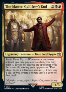 Of all the new Master cards coming out in the MTG Doctor Who crossover, this is the one getting the most hype from the community. For six mana, you get an understatted creature with Myriad, which is not very impressive. That said, The Legend rule is completely turned off for all tokens you control, which makes using Myriad on legendary creatures possible. It can also amplify the potential of other copy effects. The real line of text that has everyone excited, however, is at the bottom of the card.