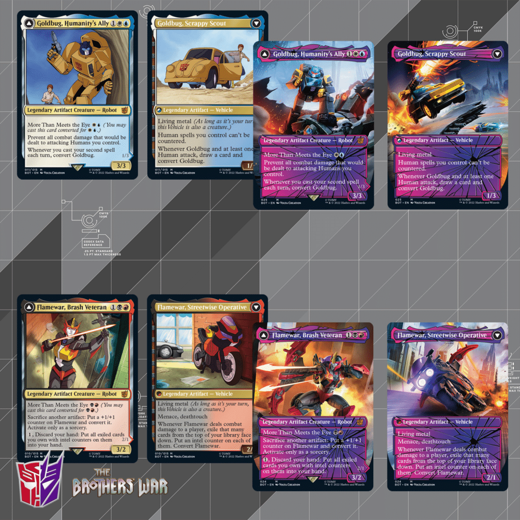 Wait… didn’t we have a giant news bomb last night? Well, things won’t be stopping anytime soon, as Hasbro just revealed a vast new crossover from within their franchise: Transformers. This franchise recently had a card game that went a bit south, but MTG and TCG fans should be happy to see some of their favorite Autobots and Decepticons appear at their tables. These cards will be available in Brothers’ War Bundles, Set Boosters, and Collector Boosters! Some new mechanics were premiered with these guys, so there’s a bit to unpack here. Here’s our first look at the MTG Transformers crossover!
