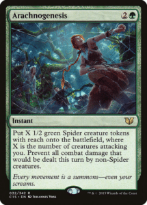 Basically, for every creature attacking you, Arachnogenesis creates that many 1/2 Spider creature tokens with Reach. Additionally, Arachnogenesis will prevent all non-Spider creature damage, allowing your tokens to act as removal – as long as you’re not in a Spider tribal mirror, that is.