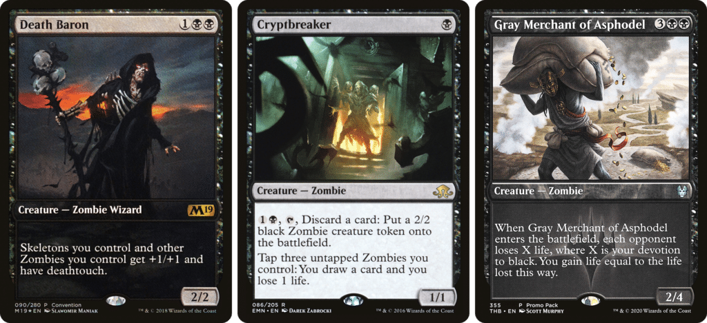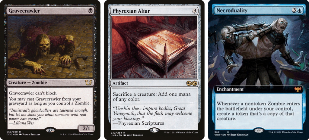 Thanks to Necroduality, you can make infinite Zombies alongside Gravecrawler and Phyrexian Altar. Also, if you add an effect such as Zulaport Cutthroat you can drain your opponents for the win. Also, throwing any Legendary Zombies with Necroduality helps if you have a Blood Artist or Zulaport Cutthroat in play, since you can sacrifice the token.