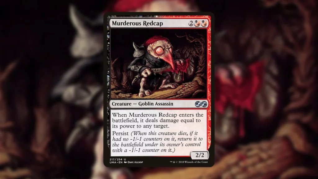 When played together, Murderous Redcap, Warden of the Grove, and a sacrifice outlet are a quick way to end a game of Commander. Because Warden of the Grove cancels out the -1/-1 counter that Persist provides, with a free sacrifice outlet, Murderous Redcap can keep dying and coming back to life, killing everyone in the process.