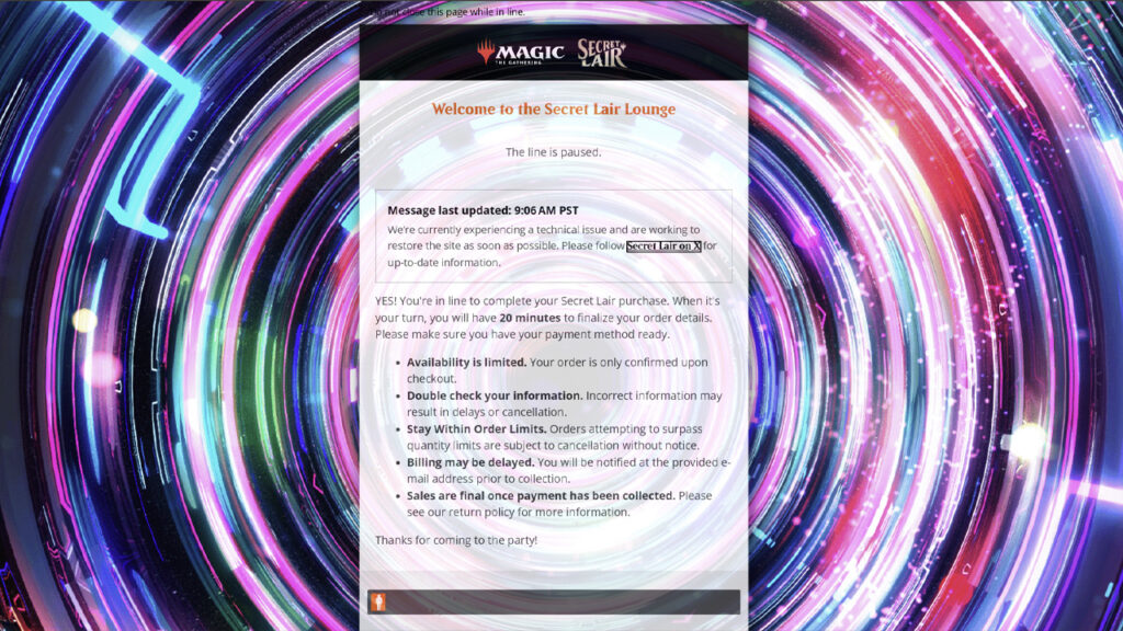 It appears that the Secret Lair site is currently experiencing technical issues. While promises are made to get the process moving as quickly as possible, it has been suggested to follow the Secret Lair brand on X for updates. Ten minutes after the crash was initially announced to customers in line, the official Secret Lair X page posted this: