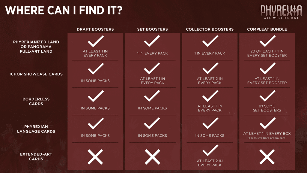 About eight hours after Phyrexia: All Will Be One’s preview season was kicked off on Twitch and YouTube, the official MTG Twitter account posted this infographic. Contained within is where players should expect to find specific Booster Fun variants appearing in Phyrexia: All Will Be One. Needless to say, there is a lot to break down here.