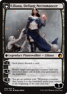 Her planeswalker side will do everything you want in the Undead Unleashed. It fuels your graveyard while simultaneously forcing your opponents to discard. It reanimates creatures from your graveyard. And if you can manage to use her ultimate ability, all of your zombies will be crawling out of their graves for the rest of the game.