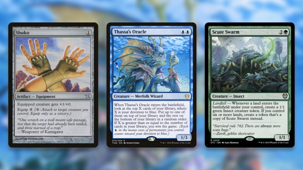 With a zero mana equip cost Equipment out, Nadu, and a Scute Swarm, you can draw through your entire deck in a single turn. Each token Swarm creates will get its own two triggers, which all but guarantees you another Landfall trigger, and another token. Once this is done, You can end the game in all manner of ways. The lands from Nadu’s ability enter untapped, so a big X-damage Burn spell is an option. Alternatively, you can just drop a Thassa’s Oracle.