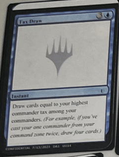 Typically, the Commander Tax is solely a downside, requiring extra mana investment, so you have to be careful about letting your Commander die multiple times. However, playtest cards like Tax Draw actually get better the higher the Commander Tax is for your Commander. Tax Draw specifically lets you draw cards equal to the highest Commander tax among your Commanders, so the more you’ve cast them, the better.