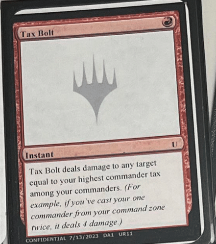 Typically, the Commander Tax is solely a downside, requiring extra mana investment, so you have to be careful about letting your Commander die multiple times. However, playtest cards like Tax Draw actually get better the higher the Commander Tax is for your Commander. Tax Draw specifically lets you draw cards equal to the highest Commander tax among your Commanders, so the more you’ve cast them, the better.
