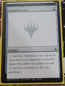 This is where Splitter Second comes into play. Normally, while cards with Split Second can’t be responded to with spells or traditional activated abilities that use the stack, players could still activate mana abilities if they wanted to. The goal of Splitter Second is likely to prevent the opponent from simply tapping their Lands in response to you sacrificing Trampled Lotus and tapping their Lands. Trampled Lotus’s design definitely seems much more unlikely to show up in sets in the future.