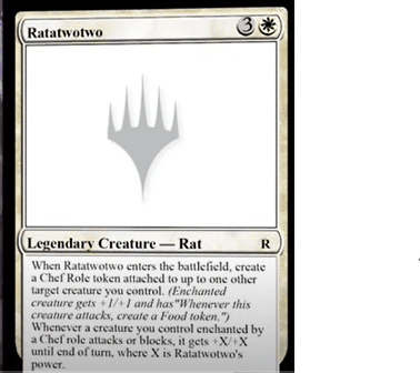 Roles are certainly not new as a concept, but some of these playtest cards introduced new types of roles that seem perfectly reasonable to appear in the future. For example, Ratatwotwo is a Legendary Rat that creates a Chef Role token attached to another Creature you control when it enters the battlefield. A Chef Role specifically gives the Enchanted Creature +1/+1 and the ability to create Food tokens whenever it attacks.