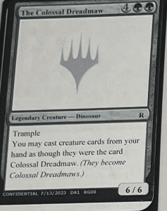 In addition to new mechanics, plenty of the playtest cards also made funny references to previous cards throughout MTG’s history. The Colossal Dreadmaw, for instance, is a 6/6 with Trample, just like Colossal Dreadmaw, but it allows you to play your other Creatures from hand as though they were Colossal Dreadmaws as well! This is a funky ability but seems pretty fun for a wacky Limited environment.