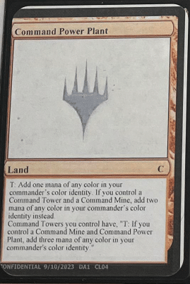 Some cards, like Command Power Plant, didn’t directly reference other cards from MTG’s past by name, but it’s clear what previously existing cards were being referenced anyway. Commander Power Plant has the ability to tap for mana of your Commander’s color identity, just like Commander Tower does normally. However, if you control Command Power Plant, Command Mine, and Command Tower, your Command Tower now can tap for three mana instead of just one.