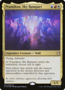 As you may imagine, this can lead to some interesting circumstances when Pramikon is copied. Since Pramikon chooses its direction upon entry, cards that enter the battlefield as a copy of Pramikon can choose the other direction, which will lock the board from attacking.